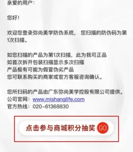 完成产品查验真伪,并点击“参与抽奖”,即可前往弥尚科技美学商城,参与积分抽奖