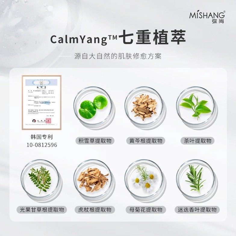 Focus on Gentle Hydrating and Repairing Key highlight ingredients: seven plant extracts, transdermal peptides (Decapeptide-4), Oligopeptide-1, repair damaged skin surface, treat sensitive, allergic, and acne-prone skin, increase skin cell vitality, promote skin metabolism, and enhance skin resistance.